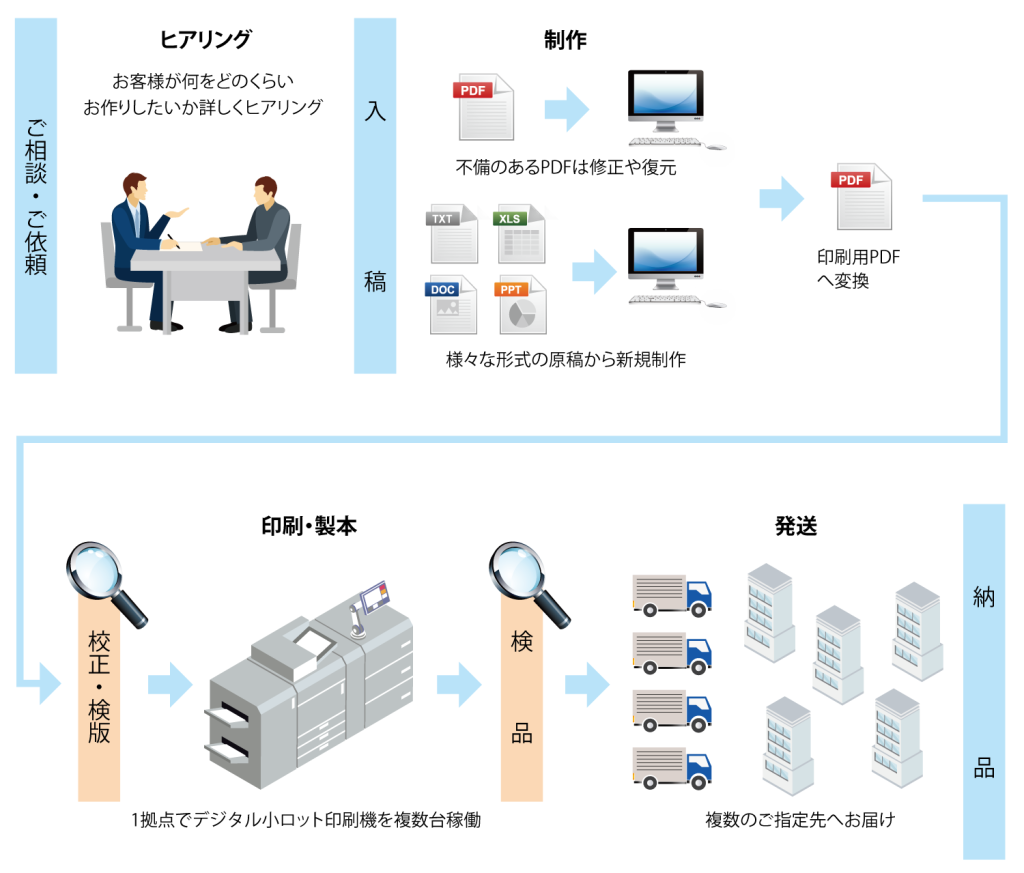 御社が自社内で制作し、配布している様々な学習教材。種類も多く、配布先も多岐にわたり、その上でスピードが求められるため、運用に難しさを感じることもあるかと思います。それを私たちにお任せいただけませんか?原稿をご入稿いただければ、スピーディーかつ確実な印刷プロセスを経て、指定先まで発送・納品いたします。